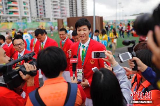 当地时间8月3日上午9时30分,中国奥运代表团在里约奥运村举行升旗仪式。图为中国击剑队男子花剑运动员雷声接受媒体采访。中新网记者 盛佳鹏 摄中新网里约热内卢8月3日电(记者 卢岩 王牧青 王曦) 中国奥运体育代表团团长刘鹏在当地时间3日的升旗仪式后透露,男子花剑奥运冠军雷声将作为开幕式代表团旗手,高擎国旗出现在8月5日的里约奥运会开幕式上。