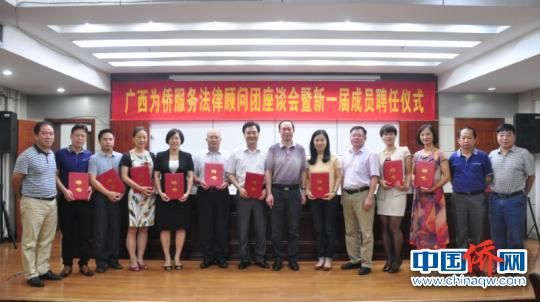 与会人员合影 林浩 摄中国侨网南宁8月30日电 (林浩 何泉蓉)广西侨办29日举行仪式,向徐新宁、杨瑜、陆宇玲等10名知名律师颁发聘书,组建新一届“为侨服务法律顾问团”。
