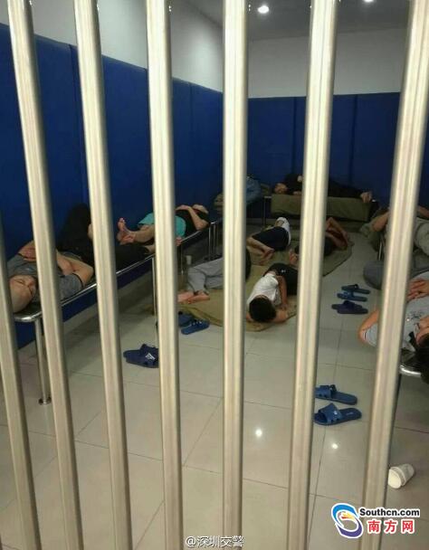 9月16日清晨,深圳交警官方微博发布一张照片,并配以文字“21名醉驾者的中秋夜”。照片中醉驾者横七竖八躺在大门紧锁的室内,许多都睡的挺沉。