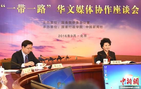 9月26日,由中国国务院侨办主办,国家行政学院、中国新闻社承办的“一带一路”华文媒体协作座谈会在北京举行。国务院侨办主任裘援平出席座谈会并讲话。中新社记者 张勤 摄
