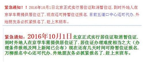 北京市某驾校的一则紧急通知称,“2016年10月1日北京正式实行居住证,取消暂住证。到时,外地人在京学车需提供居住证了。现在还可持暂住证报名……外地朋友务必抓紧报名了。赶上末班车。”