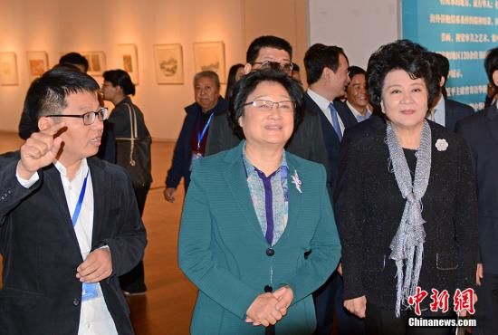 10月11日,由中国国务院侨务办公室、天津市人民政府和中国美术家协会共同主办的第二届“全球华人书画展”在天津美术馆启幕,全国政协副主席李海峰(中)、国务院侨办主任裘援平(右)等参观展览。本次书画展以“丝路远帆宏图展,翰墨凝侨筑梦圆”为主题,团结鼓励海外华人书画家共同用艺术语言讲好“中国故事”。据悉,为期6天的展览共展出五大洲40个国家和地区120余位书画家的152件形态多样、内容丰富的作品。 中新社记者 佟郁 摄
