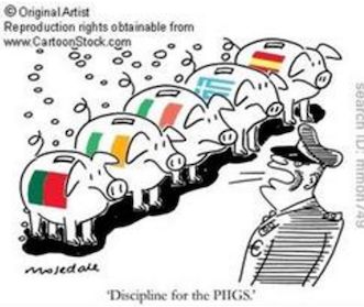 “笨猪五国”是其中一个非常有名的贬称,它恰为五个国家首字母的缩写——PIIGS。这五国分别为葡萄牙(Portugal)、意大利(Italy)、爱尔兰(Ireland)、希腊(Greece)、西班牙(Spain)。