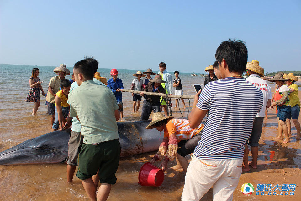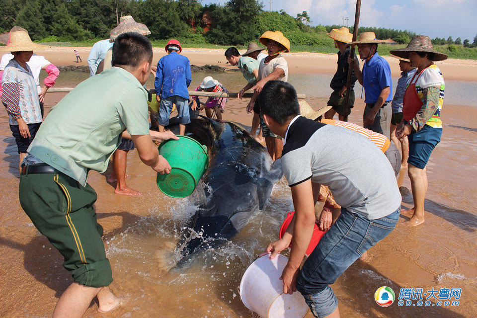 鲸鱼搁浅广东雷州海滩 小渔村全村出动营救送回大海