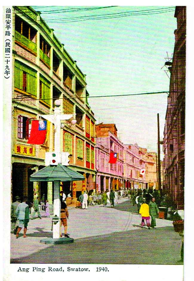 安平路明信片反映了上世纪40年代汕头市安平路的商业景象,画面上那个巡警执勤的交通岗亭,是当时最为先进的警用设施,汕头当其时的繁荣可见一斑。