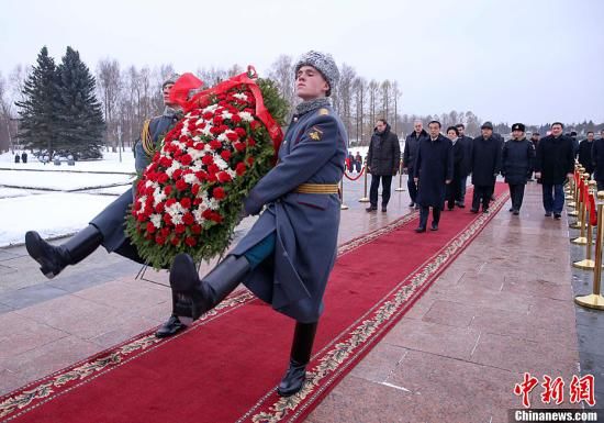 位于圣彼得堡市郊的皮斯卡廖夫公墓,安葬着在世界反法西斯战争中牺牲的近50万烈士和平民。伴随着默哀曲的肃穆旋律,李克强冒着漫天飞雪的严寒天气缓步拾阶而上,向公墓内的祖国母亲纪念碑献花圈。军乐队随即奏响中俄两国国歌,李克强向纪念碑行注目礼,随后在俄高级官员陪同下检阅仪仗队分列式。