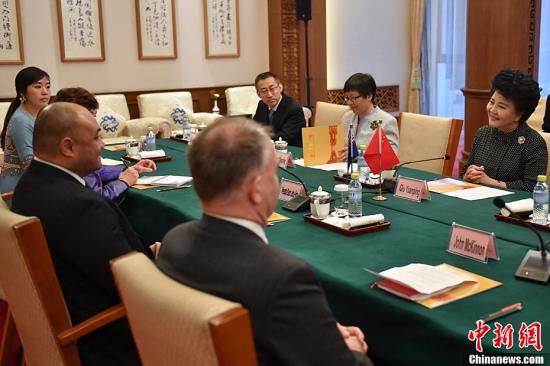 11月8日,中国国务院侨务办公室主任裘援平在北京与来访的新西兰民族事务部部长皮赛塔 山姆·罗托-伊阿举行会谈。中新社记者 崔楠 摄