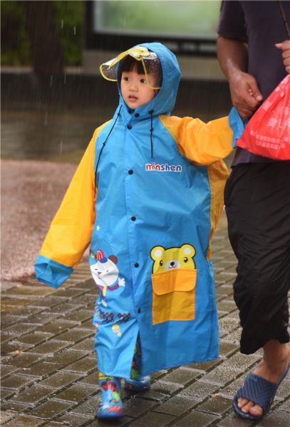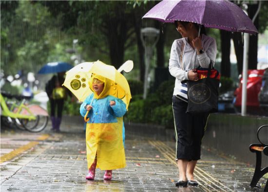 与大人一脸严肃相比,孩子对下雨天却觉得新鲜好玩。