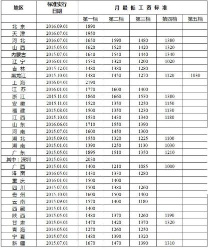 全国各地区月最低工资标准情况(截至2016年12月)。来自人社部网站