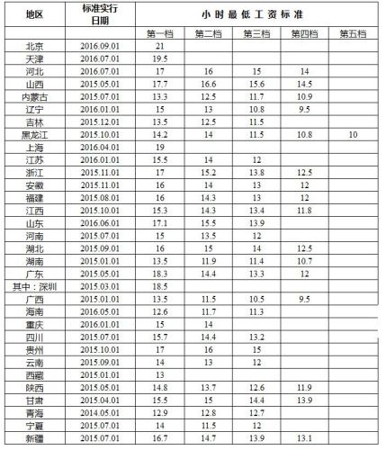 全国各地区小时最低工资标准情况(截至2016年12月)。来自人社部网站中新网北京12月14日电(记者 李金磊)人社部13日在其官网更新了最新的全国各地区最低工资标准情况,数据显示,上海月最低工资标准达2190元,为全国最高。小时最低工资标准最高的为北京,达21元。你家乡的最低工资标准有多高呢?快来看看。