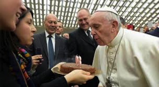 14号在梵蒂冈的保禄六世大厅,教宗在跟在场所有观礼者问候时,有位女教友捧着一个点燃80蜡烛的蛋糕送给他,吹了蜡烛后,教宗语出惊人地跟那些提前为他过生日的教徒们说:“我很感激你们祝贺我将来临的生日,再次感谢你们…。。但是, 我要跟你们说件好笑的事: 在我的国家, 提前祝贺生日是很‘衰’的”。