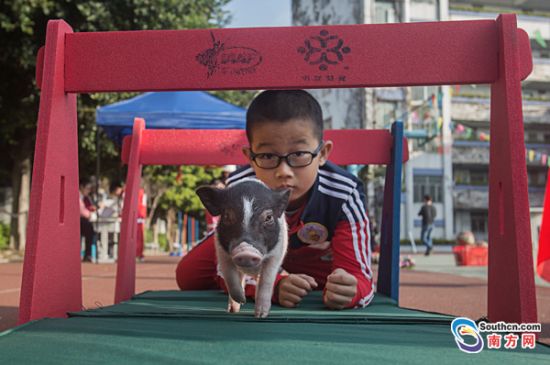 在检测现场,一头被学生们称作“威尔伯”的小香猪出现,陪着孩子们一起进行游戏闯关。“威尔伯,come here”,听到学生的呼唤,小香猪快速的朝前方跑去。
