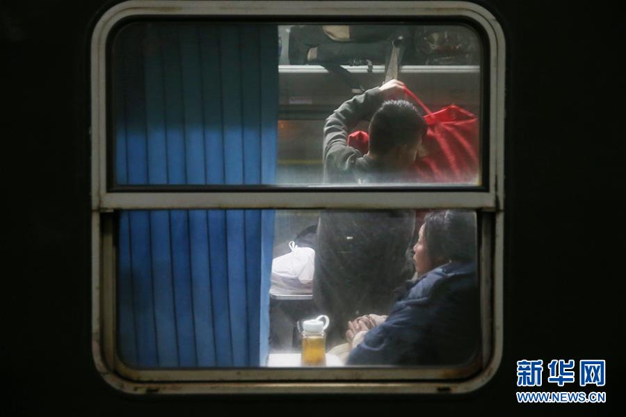 1月13日凌晨,旅客在由上海南发往重庆北的3055次列车内放置行李。此趟列车是由上海始发的第一列春运列车。当日,为期40天的2017年春运开始。预计2017年春运期间,全国旅客发送量将达到29.78亿人次,比上年增长2.2%。