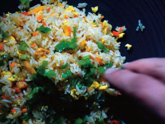 中国人的主食以米饭为主, 每餐配以不同的食材:蔬菜、鱼类、白肉、红肉、汤等等。水稻由于具有茉莉香,所以很适合在 蒸熟后食用。要做这道菜,首先要记住,米饭至少要提前四个小时准备好,否则会过于黏稠或者缺少嚼劲。米饭蒸好后我们要把 它放置在干燥阴凉的地方(注意 不能放在冰箱里)。 在许多“意大利化”的中餐馆,很多人都喜欢点炒饭,尤其是广东炒饭。其实炒饭的种类有很多种,有带菠萝、虾仁以及鸡肉的等等。 我在罗马中餐馆工作的时候,经常看到一种“五色炒饭”,除了基本的葱和鸡蛋外,还添加了 许多五颜六色的蔬菜,如辣椒、胡萝卜、西葫芦(也可以加豌豆) 等。这道菜简单易做,而且非常可口。