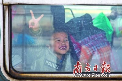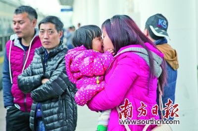广州火车站,一名男子将小孩裹在怀里踏上返乡路。