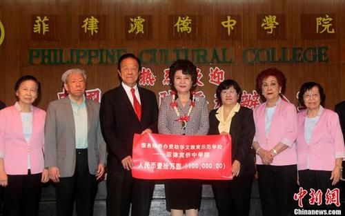2月7日,中国国务院侨务办公室主任裘援平率团在马尼拉连续走访菲律宾侨中学院和菲律宾中正学院,向这两所知名华文学校颁发“海外华文教育示范学校”资助金。图为裘援平向菲律宾侨中学院颁发“海外华文教育示范学校”资助金。中新社记者 张明 摄原题:国务院侨办主任裘援平走访菲律宾知名华校