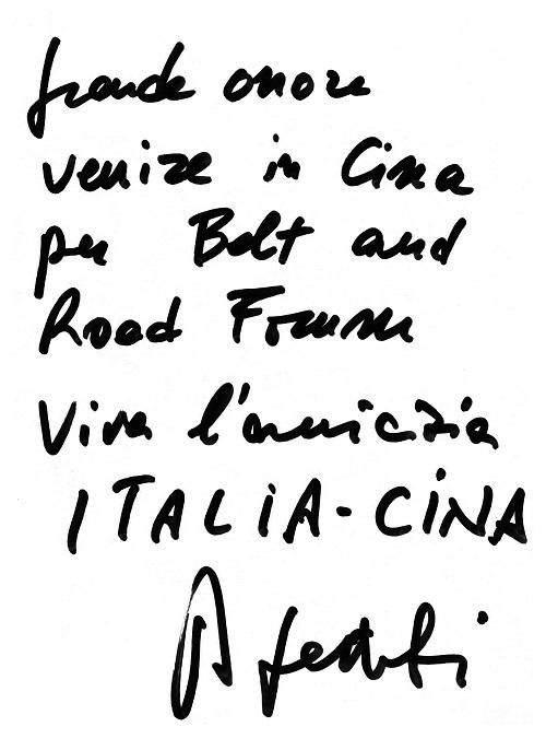 在采访结束后,真蒂洛尼题词,对“一带一路”国际合作高峰论坛表达祝愿:“非常荣幸到中国参加‘一带一路’论坛,意中友谊万岁!”(人民网罗马5月13日电)