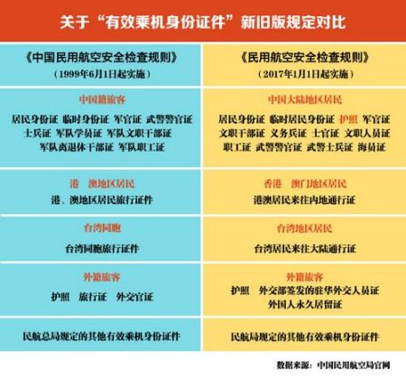 新旧版安检规则中乘坐国内航班的旅客有效乘机身份证件的种类对比。制图:张舰元中新社北京5月23日电 (记者 冉文娟)23日午间,中国民航局公安局对网传“只用护照或通行证不能直接乘坐国内航班”消息作出回应,称中国护照可以作为有效乘机身份证件,办理国内航班购票、值机、安检手续。