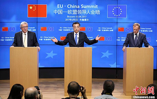 当地时间6月2日下午,中国国务院总理李克强同欧洲理事会主席图斯克、欧盟委员会主席容克共同会见记者,介绍第十九次中国–欧盟领导人会晤成果。中新社记者 刘震 摄中新社布鲁塞尔6月2日电 (记者 郭金超 沈晨)当地时间6月2日上午,中国国务院总理李克强在布鲁塞尔欧洲理事会总部同欧洲理事会主席图斯克、欧盟委员会主席容克共同主持第十九次中国—欧盟领导人会晤。