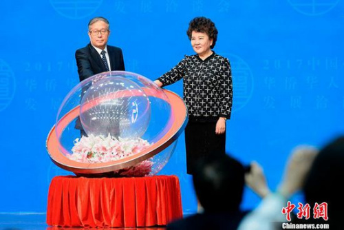 6月14日,2017中国·天津华侨华人创业发展洽谈会在天津梅江会展中心开幕。图为中国国务院侨办主任裘援平(右)、天津市委书记李鸿忠(左)出席启动仪式。 中新社记者 佟郁 摄中新社天津6月14日电 (记者 冉文娟 刘家宇)为期3天的2017·天津华侨华人创业发展洽谈会14日在天津开幕,世界侨商项目与商品博览会(合称“华博会”)同期举办。来自83个国家和地区的1500名代表津门论道“万侨创新、互利共赢”。