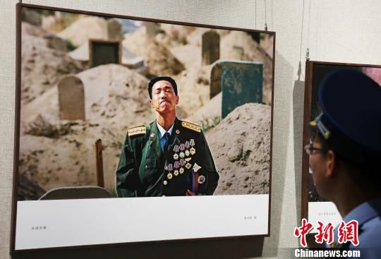 7月27日,中国军事摄影作品(邀请)展在江西南昌开幕,共展出200幅珍贵的军事题材摄影作品。 图为一名部队官兵正在欣赏摄影作品《英雄探妻》。 刘占昆 摄中新网南昌7月27日电 题:“英雄城”南昌进入“八一时间”