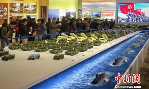 图为在“强军征程扬帆远航”主题模型展台,涵盖海陆空的50型151件武器装备模型集体亮相,吸引了观众的眼光。 尹力 摄【聚焦十九大】(十九大时光)“砥砺奋进的五年”展览与“祝福祖国”花篮成京城两大景点