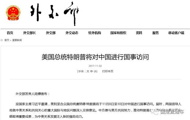 图片来源:外交部官网美国总统特朗普的首次访华之旅时间表已定。外交部发言人陆慷2日宣布:应国家主席习近平邀请,美利坚合众国总统唐纳德·特朗普将于11月8日至10日对中国进行国事访问。
