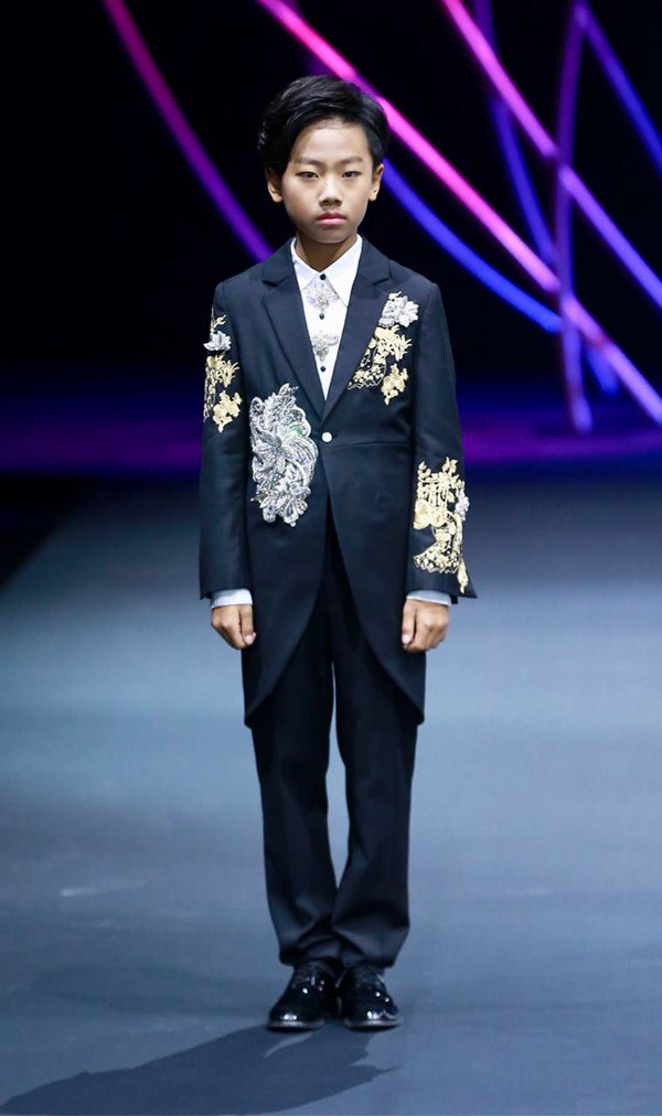 这次中国国际时装周VICKY’Z设计师许馨尹为齐显霆准备的是一套中心合璧的套装,上衣胸前及袖子都用了金色刺绣,融合苏绣和雕绣,花团锦簇,代表中国的祥和安康,希望世界和平“以和为贵”。齐显霆通过演绎,向现场观众展示了这套服装的内涵。