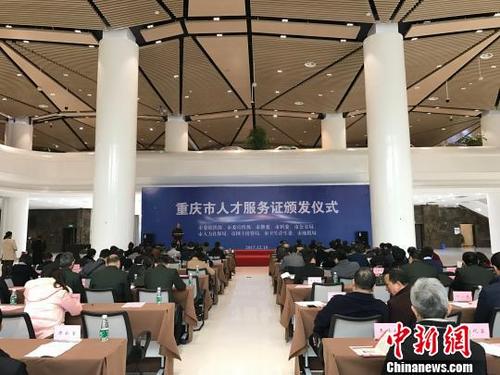 图为重庆市人才服务证颁发仪式现场。 钟旖 摄中新网重庆12月18日电 (记者 钟旖)重庆18日为该市43名海内外高层次人才颁发首批人才服务证,持证人才将在重庆“一站式”服务平台享受医疗、子女(孙子女)入学入托、配偶(子女)就业、户籍、居留签证、职称、科技、项目申报等优惠政策和便利服务。