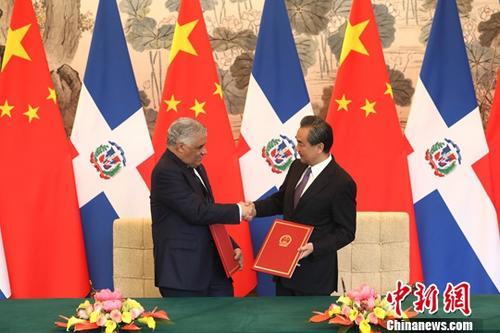 5月1日,中国国务委员兼外交部长王毅在北京同多米尼加共和国外长巴尔加斯签署《中华人民共和国和多米尼加共和国关于建立外交关系的联合公报》。自公报签署之日起,中华人民共和国和多米尼加共和国相互承认并建立大使级外交关系。中新社记者 盛佳鹏 摄