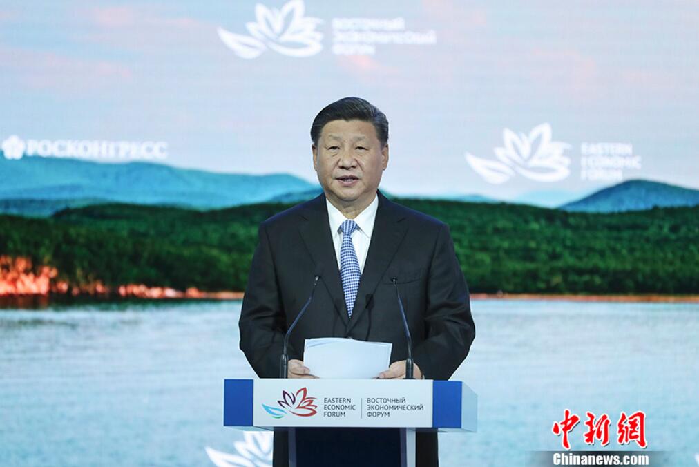 9月12日,第四届东方经济论坛全会在俄罗斯符拉迪沃斯托克举行。中国国家主席习近平、俄罗斯总统普京、蒙古国总统巴特图勒嘎、日本首相安倍晋三、韩国总理李洛渊等出席。图为中国国家主席习近平致辞。中新社记者 盛佳鹏 摄中新社符拉迪沃斯托克9月12日电 (记者 王修君)当地时间9月12日,第四届东方经济论坛全会在符拉迪沃斯托克举行,中国国家主席习近平出席会议并发表了题为《共享远东发展新机遇开创东北亚美好新未来》的致辞。在致辞中,习近平就中俄合作予以阐述,同时就共同促进东北亚和平稳定和发展繁荣提出了意见。