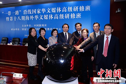 10月18日,“一带一路”沿线国家华文媒体高级研修班暨第十八期海外华文媒体高级研修班在北京结业。中央统战部副部长谭天星出席结业式,全体学员获颁结业证书。结业式上,来自50个国家和地区的百余家华文媒体共同见证了“一带一路”沿线国家华文媒体联盟的成立。中国新闻社社长章新新等出席联盟启动仪式,中国新闻社总编辑王晓晖宣读联盟宣言。图为启动仪式。中新社记者 韩海丹 摄中新社北京10月18日电 (马秀秀)“多年来,海外华文媒体立足当地、服务侨社,为讲好中国故事、推动中外友好关系发展、构建和谐侨社以及弘扬中华文化做了大量卓有成效的工作。”中央统战部副部长谭天星18日在北京表示。