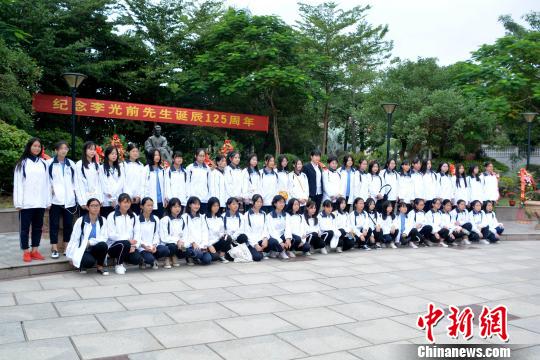 10月18日,“纪念李光前先生诞辰125周年系列活动”在李光前故乡福建省南安市梅山镇举行。图为当地学生在李光前铜像前合影。 孙虹 摄中新网南安10月18日电 (记者 孙虹)18日,福建各界人士及海内外华侨华人、专家学者共700多人相聚福建省南安市梅山镇,纪念爱国华侨、教育家、慈善家李光前先生诞辰125周年。