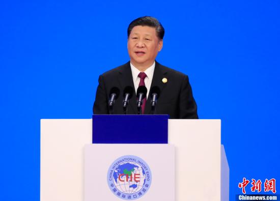 11月5日,首届中国国际进口博览会开幕式在上海国家会展中心举行,中国国家主席习近平出席开幕式并发表主旨演讲。中新社记者 杜洋 摄