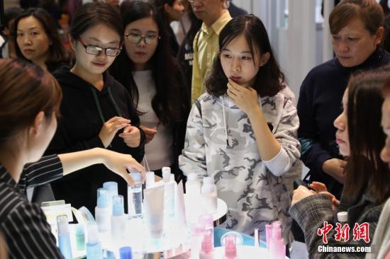 在服饰日用品展区,依旧吸引不少爱美女性前来参观,不少化妆品展台前大排长龙,挪不开步。 张亨伟 摄中新社上海11月11日电 题:从一支口红到千亿市场:进博会上看中国“美丽消费”变迁