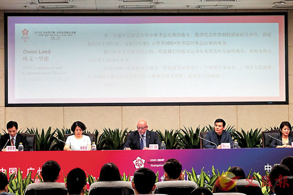 組委會昨舉行發佈會,介紹大賽籌備情況。香港文匯報記者敖敏輝 攝香港文匯報訊(記者 敖敏輝 廣州報道)“2018匯豐世界羽聯·世界羽毛球巡迴賽總決賽”將於12月12日至16日在廣州舉行。總決賽是世界羽聯世界巡迴賽體系中最高級別賽事,巡迴賽26站分站賽每個單項(男單、女單、男雙、女雙、混雙)積分排名前8的運動員參賽。這是繼世界羽聯賽事體系改革後首次在中國舉辦,也是廣州繼成功舉辦湯優盃、蘇迪曼盃、世錦賽等“大滿貫”賽事後,迎來的又一項頂級羽毛球賽事。