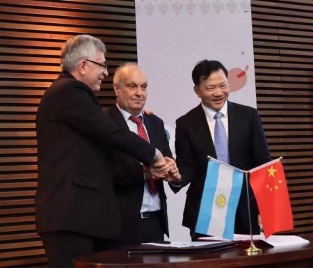 在中阿来宾的见证下,中央广播电视总台台长慎海雄和阿根廷国家广播电视台台长佩雷拉签署两个国家电视台的合作协议