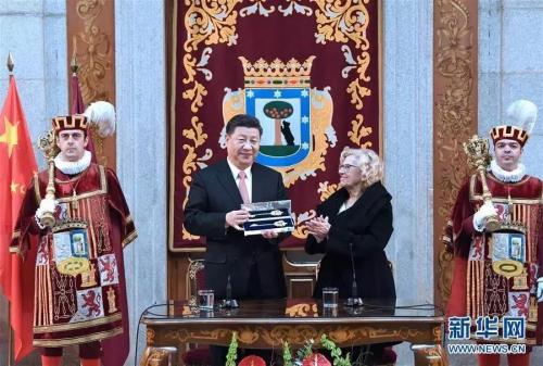 当地时间11月28日,中国国家主席习近平在马德里市政厅接受马德里城市金钥匙。新华社记者饶爱民 摄 图片来源:新华网中新社北京11月29日电 (记者 张素)中国国家主席习近平29日结束对西班牙的国事访问。受访专家表示,习近平此访有如一把“钥匙”,不仅进一步打开中西交往的大门,也进一步开启中欧友好的大门。