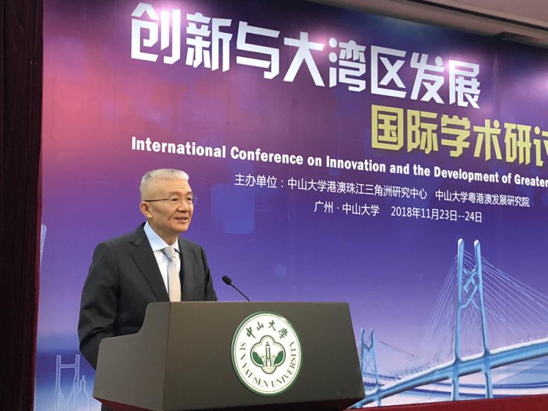 图:全国港澳研究会会长徐泽在研讨会上致辞/大公报记者方俊明摄【大公报讯】记者方俊明广州报道:全国港澳研究会会长徐泽24日在广州举行的“创新与大湾区发展”国际学术研讨会上建议将港深合作从“前店后厂”模式发展为“互为桥头堡”。