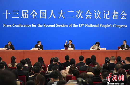 3月15日,十三届全国人大二次会议闭幕后,中国国务院总理李克强在北京人民大会堂金色大厅会见采访十三届全国人大二次会议的中外记者并回答记者提出的问题。中新社记者 杜洋 摄3月15日上午十三届全国人大二次会议闭幕后,国务院总理李克强在人民大会堂三楼金色大厅会见采访十三届全国人大二次会议的中外记者并回答记者提出的问题。