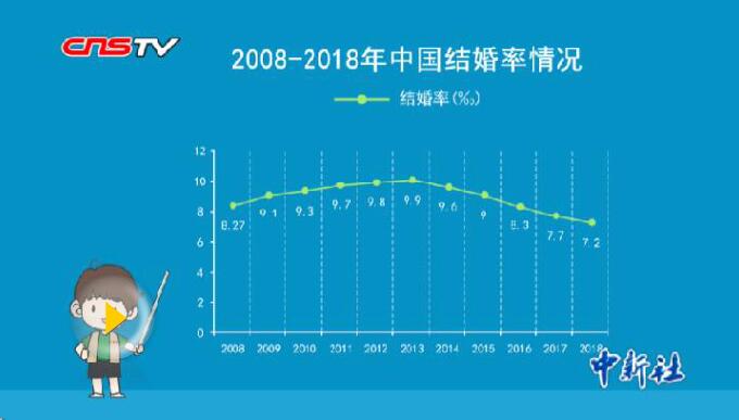2013年全国结婚率为9.9‰,2014年降低为9.6‰,2015年为9‰,2016年降到8.3‰,2017年再降到7.7‰,2018年中国结婚率只有7.2‰,创下2013年以来的新低。