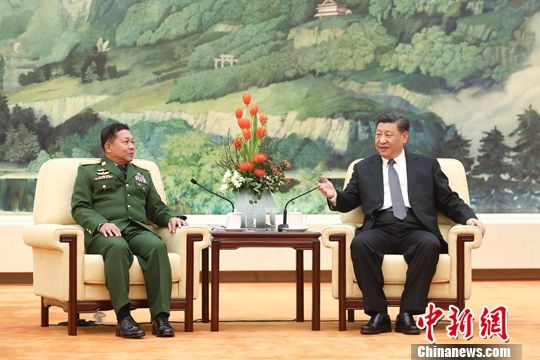 4月10日,中国国家主席习近平在北京人民大会堂会见来华访问的缅甸国防军总司令敏昂莱。中新社记者 盛佳鹏 摄中新社北京4月10日电 (记者 郭金超)中国国家主席习近平10日下午在人民大会堂会见了来华访问的缅甸国防军总司令敏昂莱。