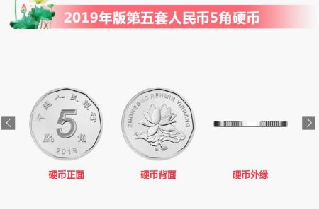 与1999年版第五套人民币1元、5角硬币和2005年版第五套人民币1角硬币相比,2019年版第五套人民币1元、5角、1角硬币调整了正面面额数字的造型,背面花卉图案适当收缩。