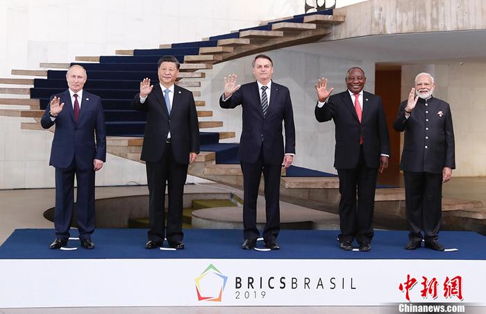 当地时间11月14日,金砖国家领导人第十一次会晤在巴西首都巴西利亚举行。图为金砖五国领导人合影。中新社记者 杜洋 摄(近观中国)与世界握手,习近平展现“可感”的中国