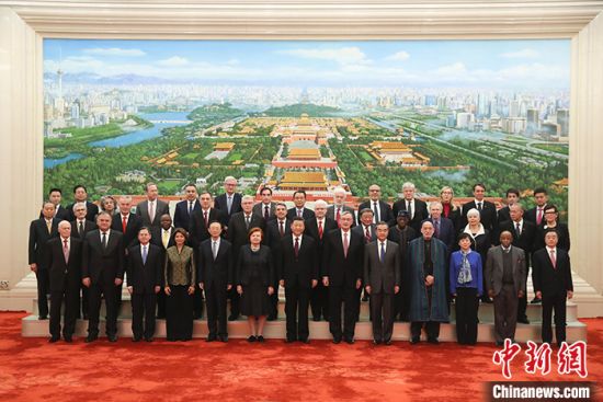 12月3日,中国国家主席习近平在北京人民大会堂会见出席“2019从都国际论坛”外方嘉宾。会见前,习近平同外方嘉宾集体合影。 中新社记者 盛佳鹏 摄中新社北京12月3日电 (记者 郭金超)中国国家主席习近平3日在人民大会堂会见出席“2019从都国际论坛”外方嘉宾。