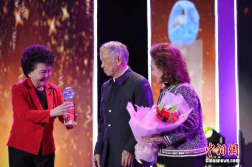 “2019年全球华侨华人年度评选”颁奖典礼上,全国政协常委、政协港澳台侨委员会副主任裘援平为陈永栽颁奖。中新社记者 李骏 摄中新社北京1月13日电 题:华商巨擘陈永栽情系华教:让中华文化在海外“后继有人”