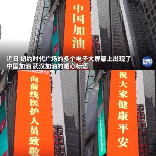 “BESTRONG,CHINA”、“以爱之名,中国加油”、“爱让不同语言凝聚同一种力量”……1月31日,美国纽约时代广场的多块大屏幕上,出现了各国语言的“中国加油”“武汉加油”。