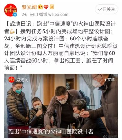 真相:1月23日下午,武汉市政府决定按北京“小汤山”医院模式,建设新型冠状病毒感染肺炎集中隔离治疗点——武汉火神山医院。据中央和国家机关工作委员会官方微博“紫光阁”报道:中信建筑设计研究总院(简称“中信设计”)临危受命,承担火神山医院设计任务。