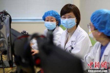 2月26日,南京市第一医院心血管内科医生张航(中)和她的同事们对患者进行网络问诊。近日,针对新冠肺炎疫情,南京市第一医院互联网医院开通了发热咨询、心血管内科、消化内科、呼吸内科、内分泌科、普外科等26个科室网络问诊,157名专家免费对患者进行在线初诊,减少慢性病患者、复诊患者来院次数,有效降低交叉感染的风险。中新社记者 泱波 摄
