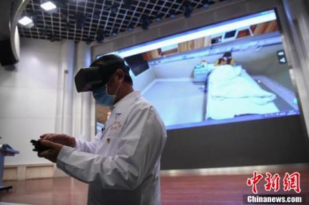 2月24日,医生利用VR设备查房。当日,云南省首个5G+VR隔离探视系统在昆明医科大学第一附属医院上线,为隔离病房里的疑似新冠肺炎患者和亲属搭建了一条沟通互动的5G“生命线”。中新社记者 康平 摄